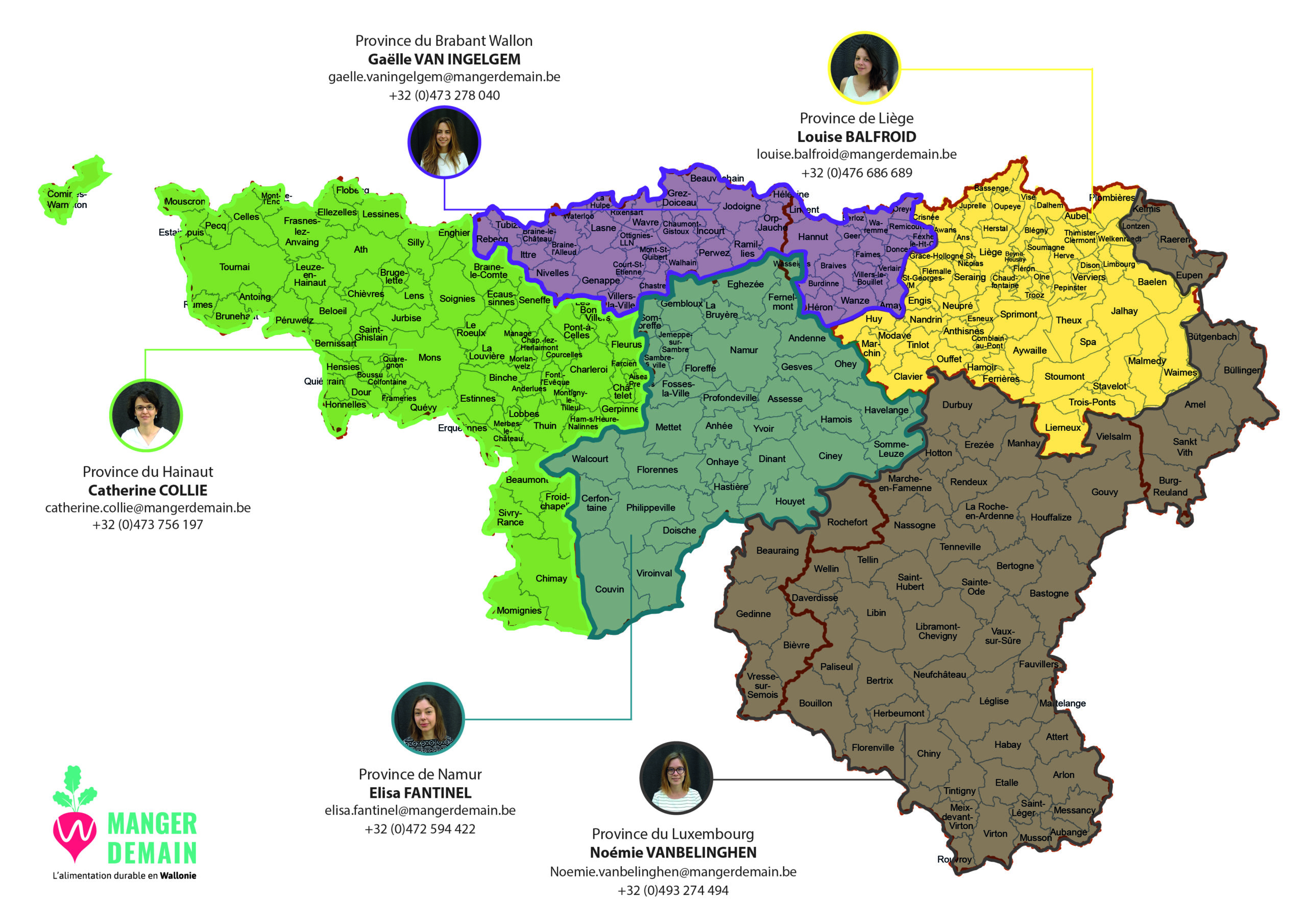 En vue d’accompagner les initiatives locales en alimentation durable, une équipe enthousiaste de cinq chargées de missions (une par territoire), est désormais active au sein de la Cellule « Manger Demain ».