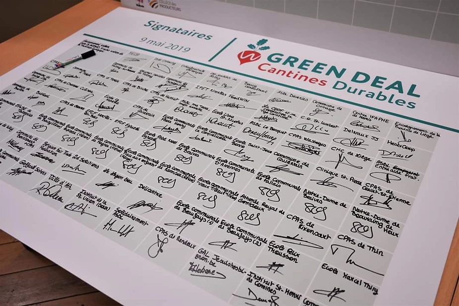 Afin de permettre aux cantines d’agir en faveur d’un système alimentaire plus durable, la Wallonie s’est effectivement dotée d’un Green Deal « Cantines Durables » : un accord volontaire entre plusieurs parties prenantes offrant aux signataires (autorités politiques, facilitateurs et cantines) un cadre de mobilisation collective au sein duquel tous s’engagent à mener des actions, endéans les trois ans, en transition écologique. En janvier, ce sont quelques 128 acteurs qui s’étaient engagés en signant le Green Deal.