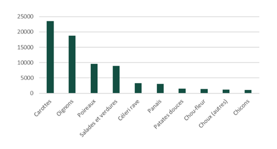 Le secteur maraicher (légumes, fruits, pommes de terre) a rencontré un succès non négligeable lors de ce coup de pouce : il concentre 56% des achats en produits bio des collectivités (en €) et 75% des quantités bio totales ! Les légumes les plus plébiscités sont les carottes, les oignons et les poireaux.