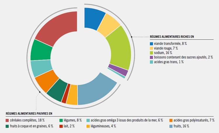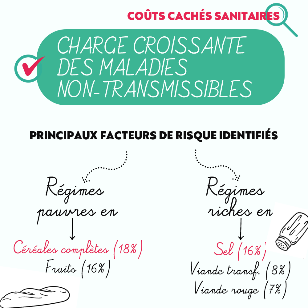 Autre nouveauté de ce rapport 2024, les coûts sanitaires sont ventilés par facteurs de risque. Le rapport permet donc de mettre l’accent sur la charge croissante des maladies non transmissibles, particulièrement concernant les régimes pauvres en céréales complètes (18%) et fruits (16%), et riches en sel (16%), en viande rouge (7%) et viande transformée (8%).
