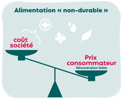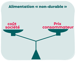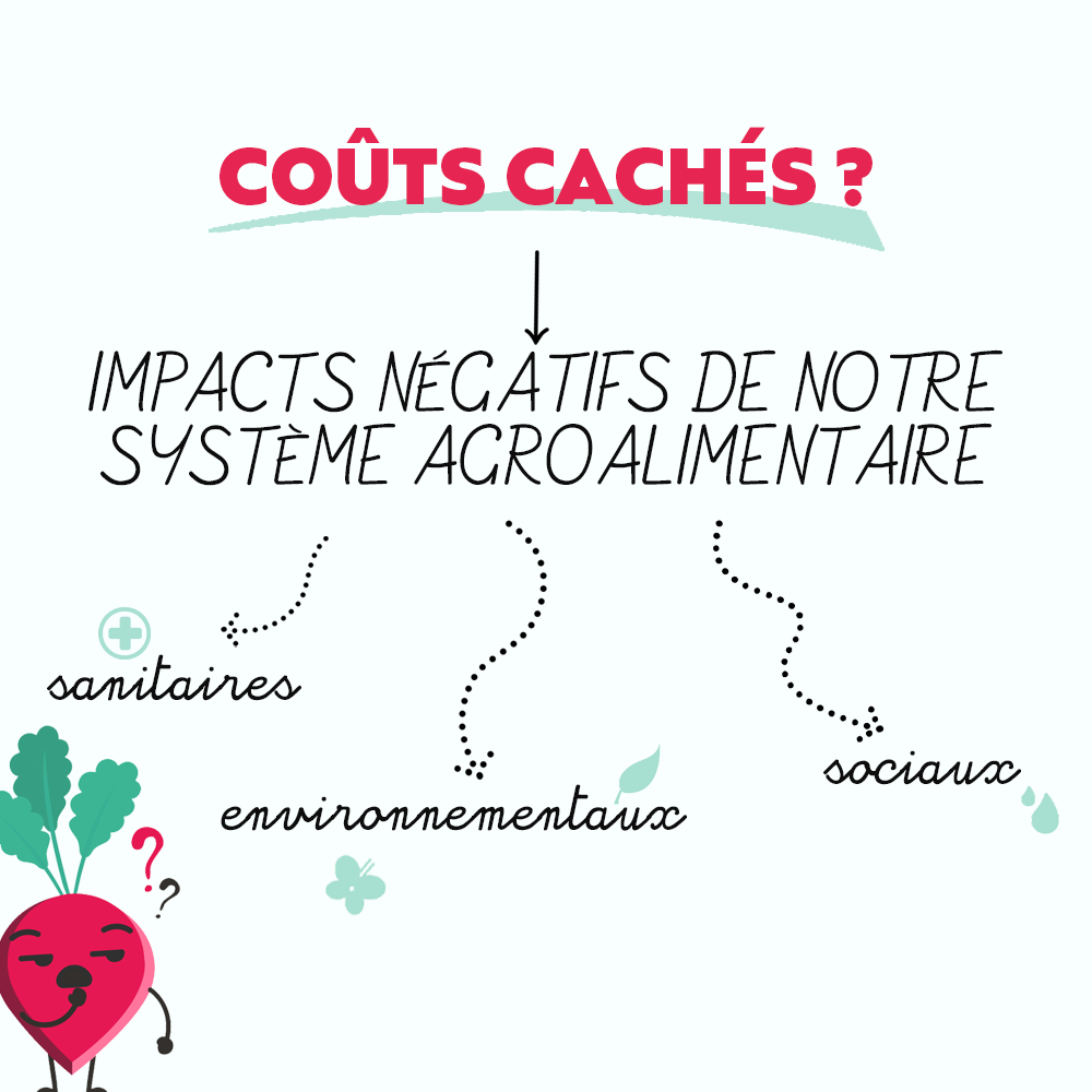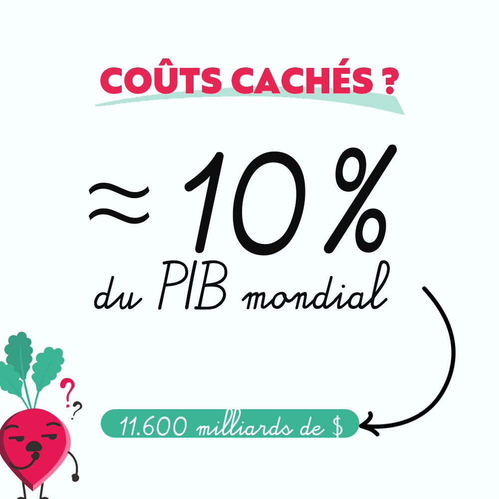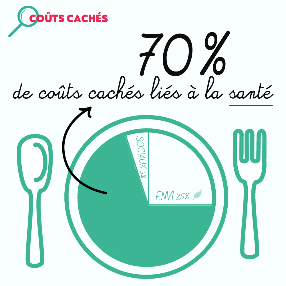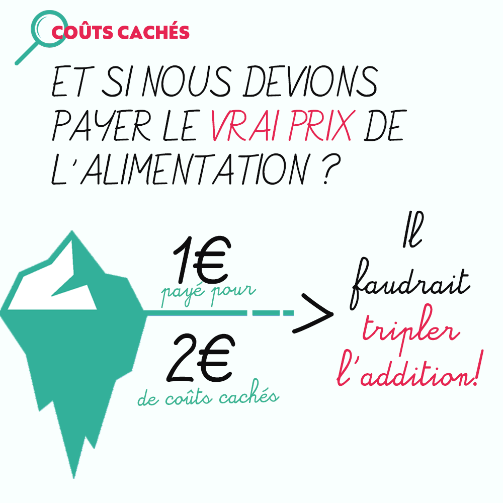 Or, pour réparer les dommages générer par nos systèmes alimentaires actuels, l’addition est salée ! Si nous payions ces coûts, il faudrait ajouter 2€ à chaque 1€ payé en caisse pour couvrir l’impact des dégradations sur la santé, sur l’environnement et sur le tissu socio-économique.