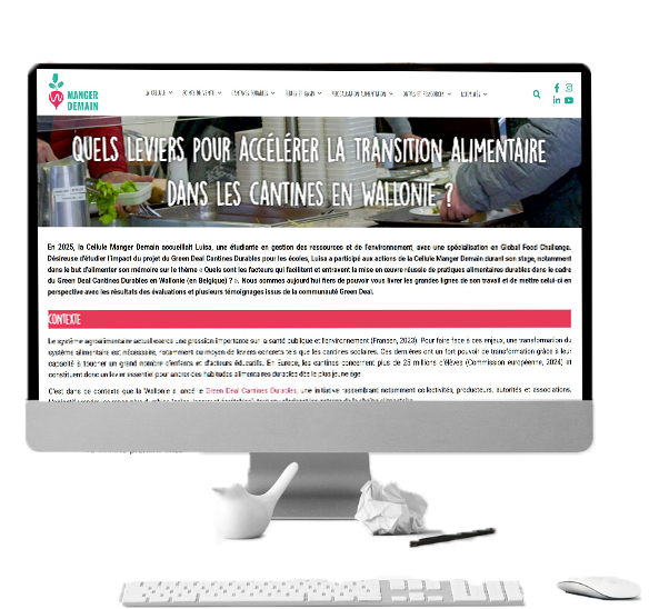 Désireuse d’étudier l’impact du projet du Green Deal Cantines Durables pour les écoles, Luisa a participé aux actions de la Cellule Manger Demain durant son stage, notamment dans le but d’alimenter son mémoire sur le thème « Quels sont les facteurs qui facilitent et entravent la mise en œuvre réussie de pratiques alimentaires durables dans le cadre du Green Deal Cantines Durables en Wallonie (en Belgique) ? ».