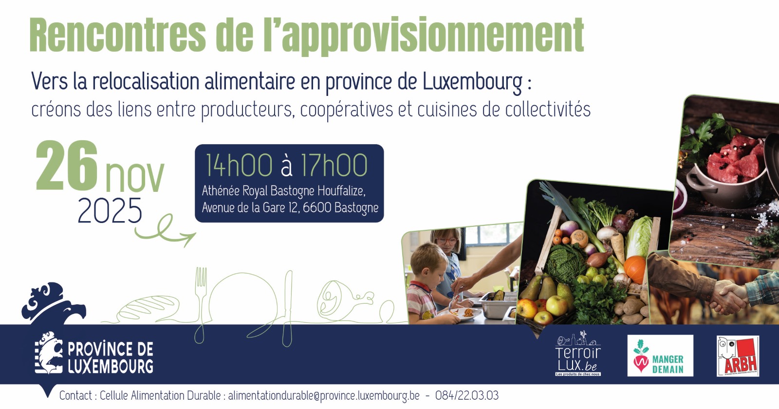 Accueil Events - Manger Demain Agenda Cantines durables Terroirlux | Rencontres de l’Approvisionnement Terroirlux | Rencontres de l’Approvisionnement Infos et inscriptions + Ajouter à mon Agenda Google + iCal / Outlook export L'événement est terminé. Date Nov 26 2025 Expiré! Heure 14 h 00 min - 17 h 00 min Lieu Athénée Royal Bastogne Houffalize (Avenue de la Gare 12 à 6600 Bastogne) Catégorie Agenda Cantines durables Partagez cet événement